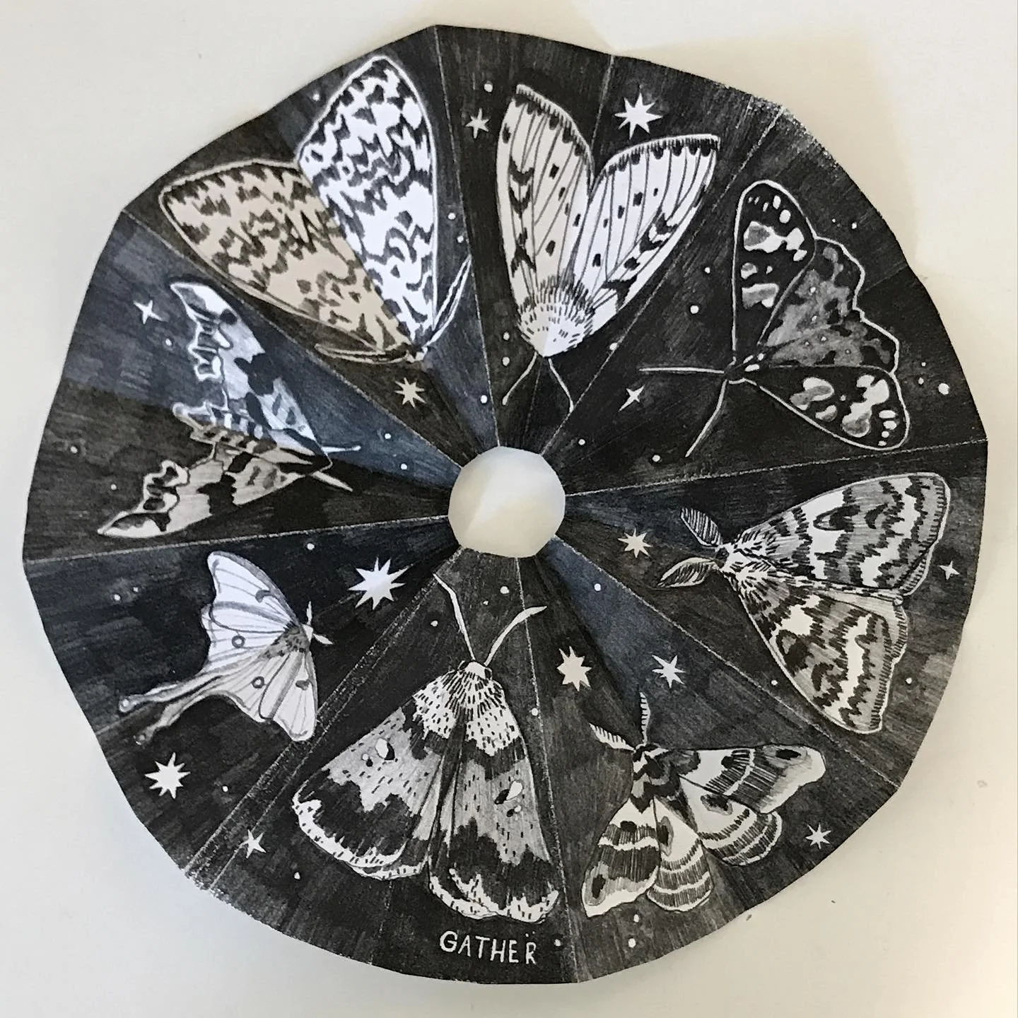 Gather, 20238 pagesblack and white publicationA tiny gathering of moths around an invisible moon, which folds up to fit in your pocket.